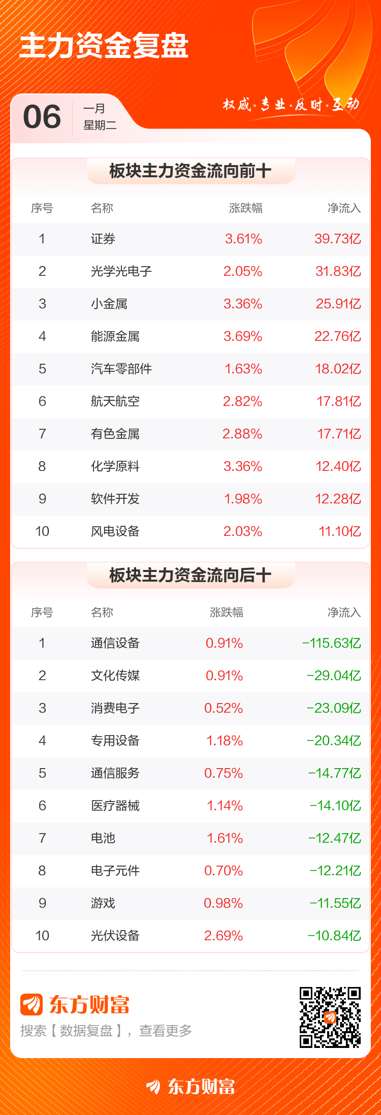 1月6日,沪指涨1.5%,深成指涨1.4%,创业板指涨0.75%。两市成交额2.81万亿,较上个交易日放量2602亿。数据显示,今日大盘主力资金净流出88.36亿。证券、光学光电子、小金属等板块主力资金流入排名居前,其中证券净流入39.73亿元。