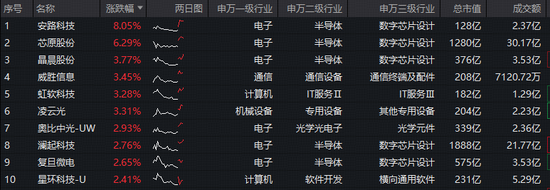 成份股方面,安路科技领涨超8%,芯原股份涨逾6%,晶晨股份、威胜信息、虹软科技、凌云光、奥比中光-UW、澜起科技等个股跟涨。